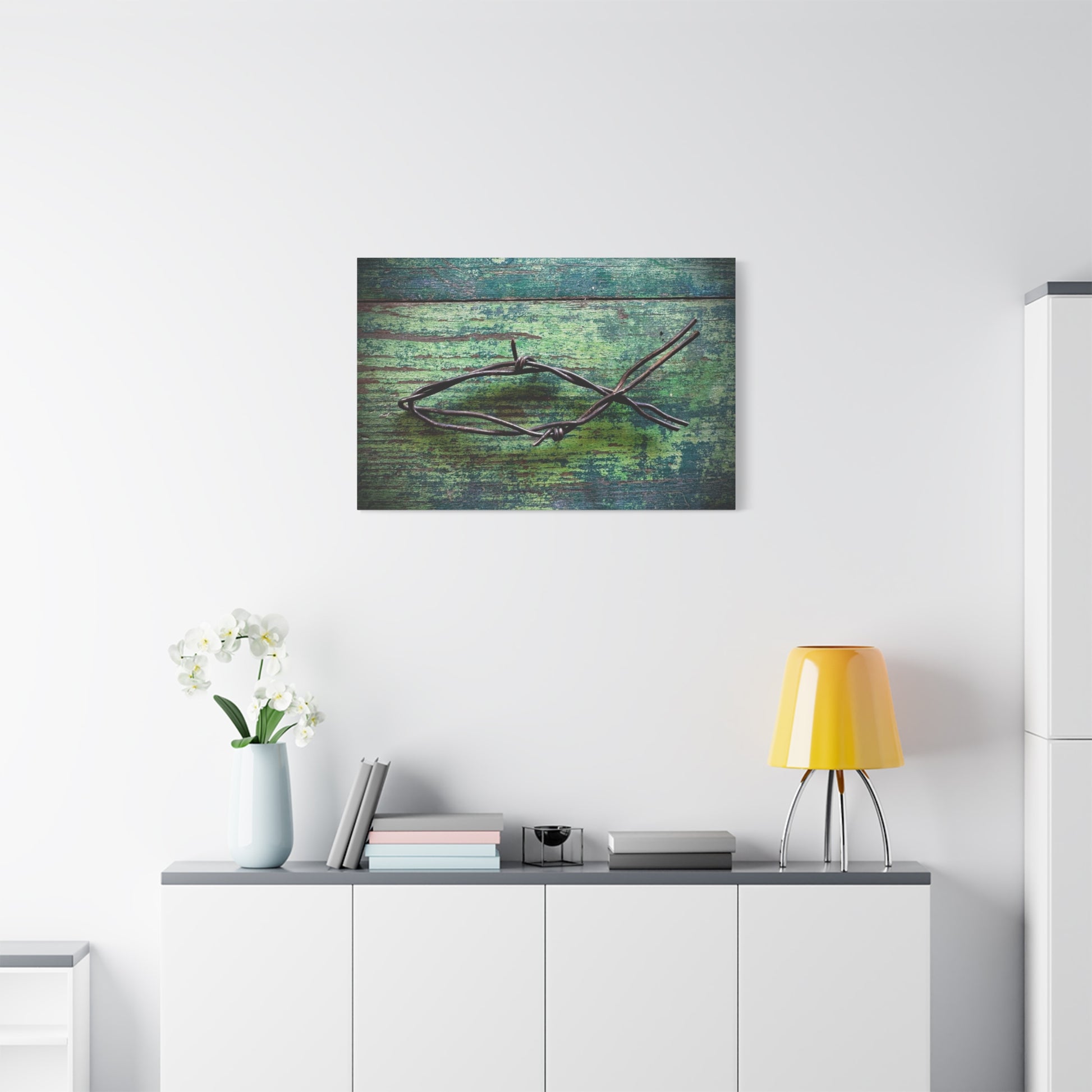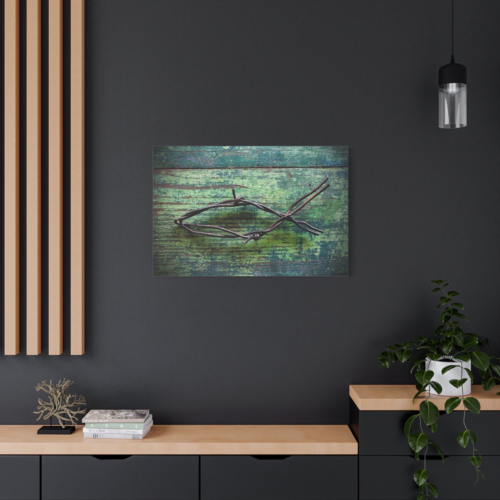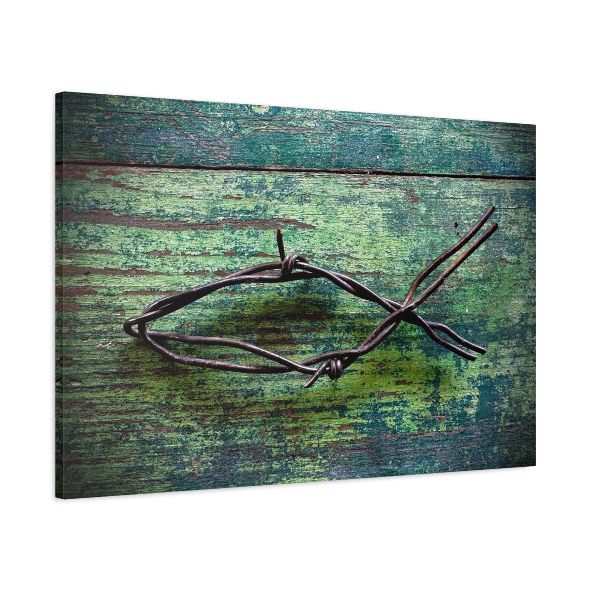 A matte stretched canvas that brings quiet, textured beauty to any wall. Weathered teal and green boards form a worn, coastal backdrop for a single, rusted piece of barbed wire arranged like a simple fish or abstract mark — a study in contrast between hard metal and soft, faded wood. The matte finish keeps glare low and emphasizes the rich, layered tones; the gallery-style 1.25" depth gives the piece presence without overwhelming a room. It arrives ready to hang with a sturdy pine inner frame, soft rubber dots to protect surfaces, and archival Greenguard Gold latex inks for long-lasting, non-toxic color. This canvas fits living rooms, studios, or entryways where textured, contemplative art invites pause and conversation.