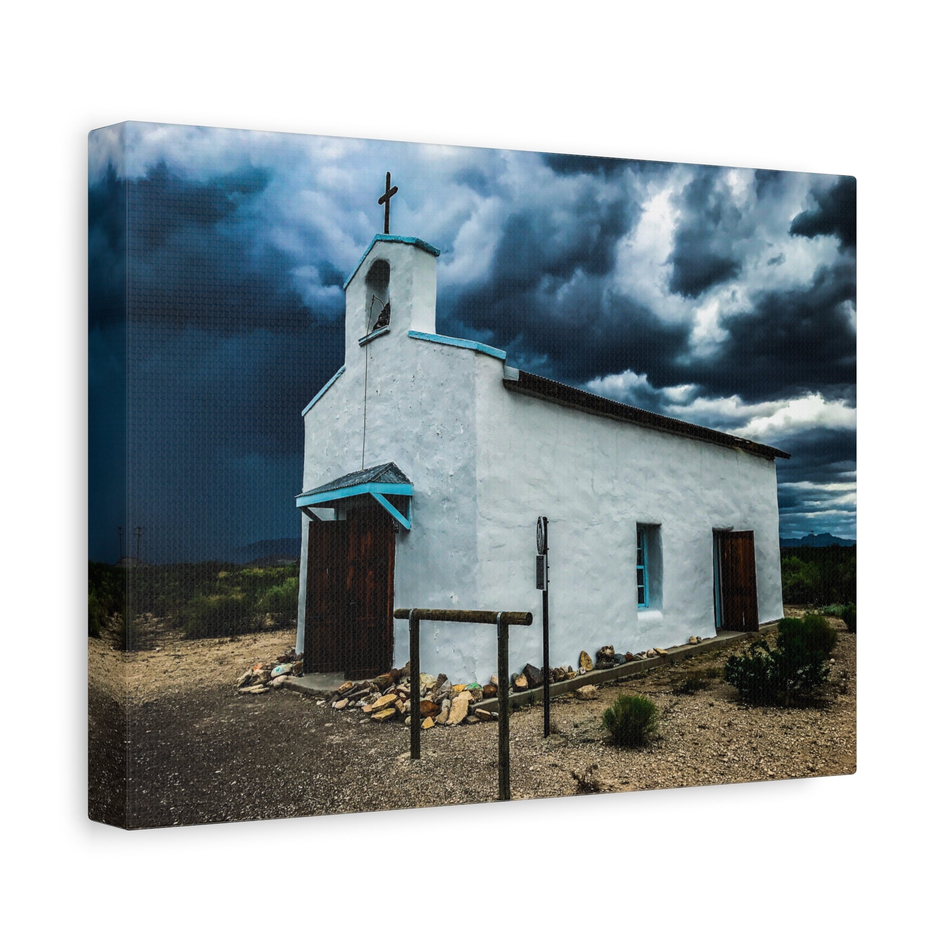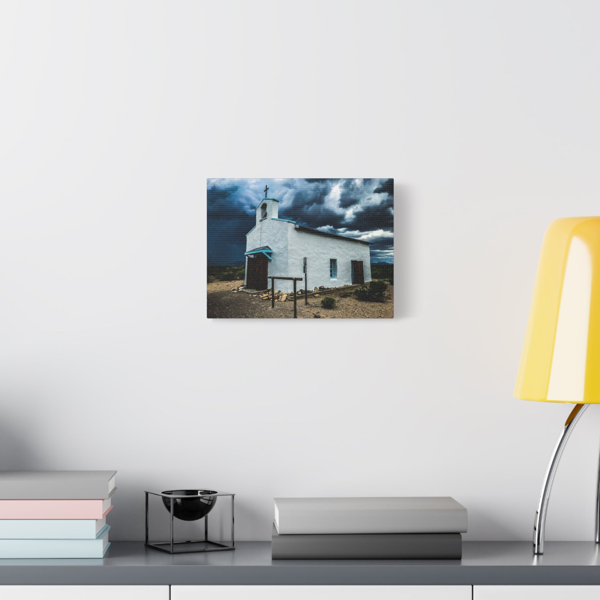 Desert Mission West Texas White Church Matte Canvas Wall Art — Southwestern Storm Landscape
