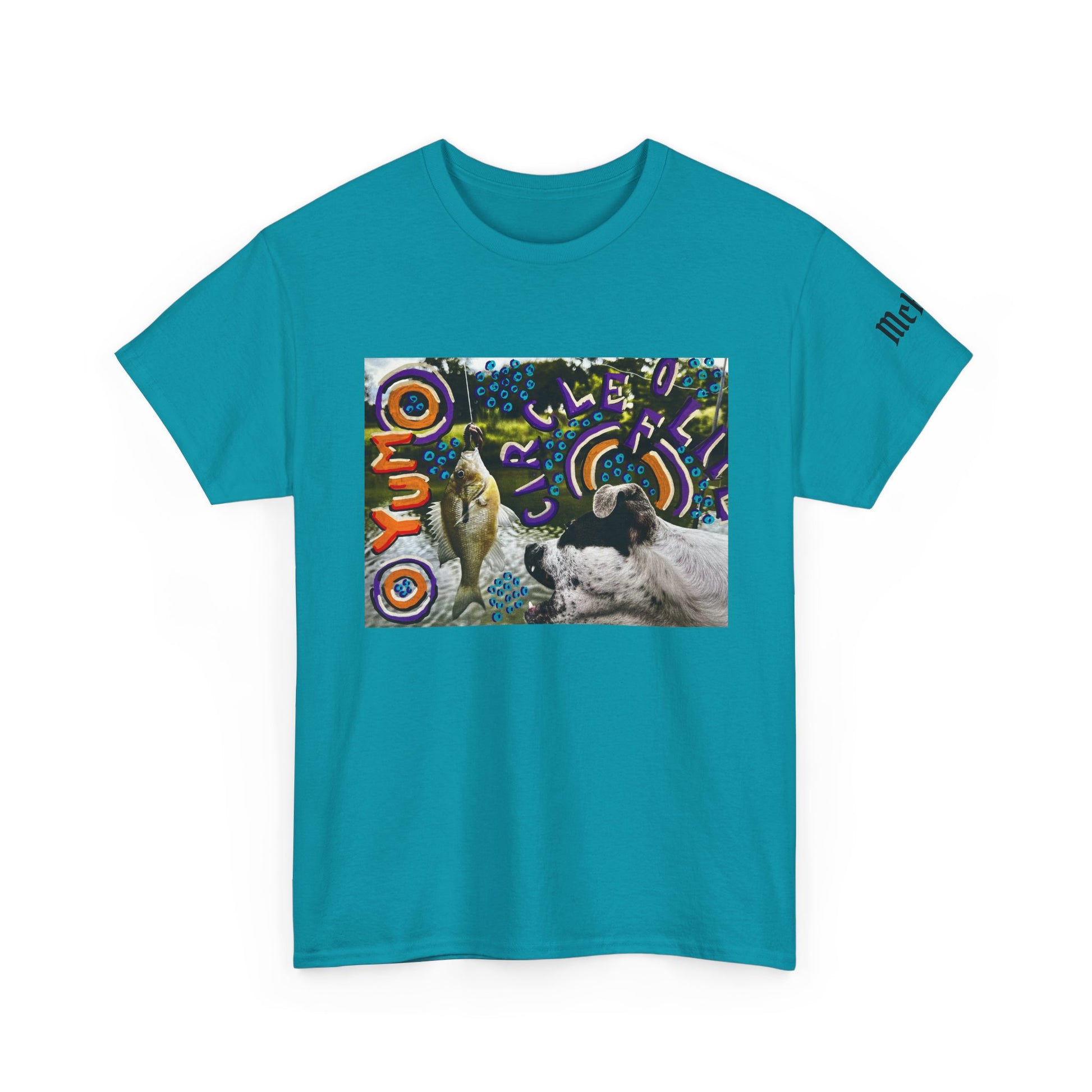 This relaxed crew-neck tee brings color-forward art to everyday wear. A bold rectangular print sits on the chest — playful swirls, concentric circles and warm oranges weave around a photographic element of two animals, creating a collage-like statement that reads like street art and a daydream. The medium-weight cotton holds the print with clarity and structure while the ribbed collar and shoulder tape keep the shape after many wears. Wear it when you want your outfit to feel casual but thoughtfully curated: layered under a denim jacket for urban afternoons, paired with worn-in jeans for gallery nights, or thrown on for morning coffee while sketching ideas. Breathable and durable, it’s built to move with you and keep the art front-and-center.