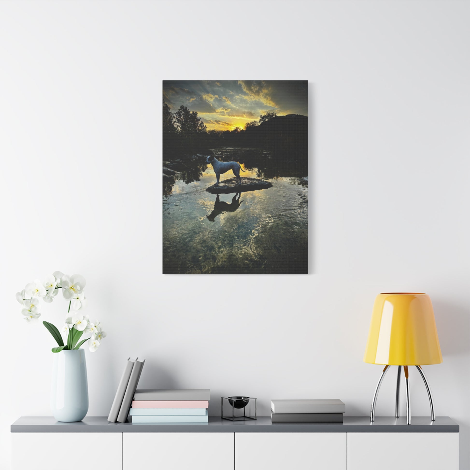 A matte stretched canvas that captures a quiet, golden moment by the water — a lone dog standing on a rock as the sunset melts into the river and sky. The muted, textured finish brings out the warm dusk tones and the glassy reflections below, creating depth without glare. Lightweight but solid, this canvas arrives ready to hang with a built-in back hanging system and soft rubber dots to keep it steady against the wall. It’s a calm, contemplative piece that slides seamlessly into a nature-focused living room, a cozy cabin wall, or an entryway where the first impression is gentle and soulful.