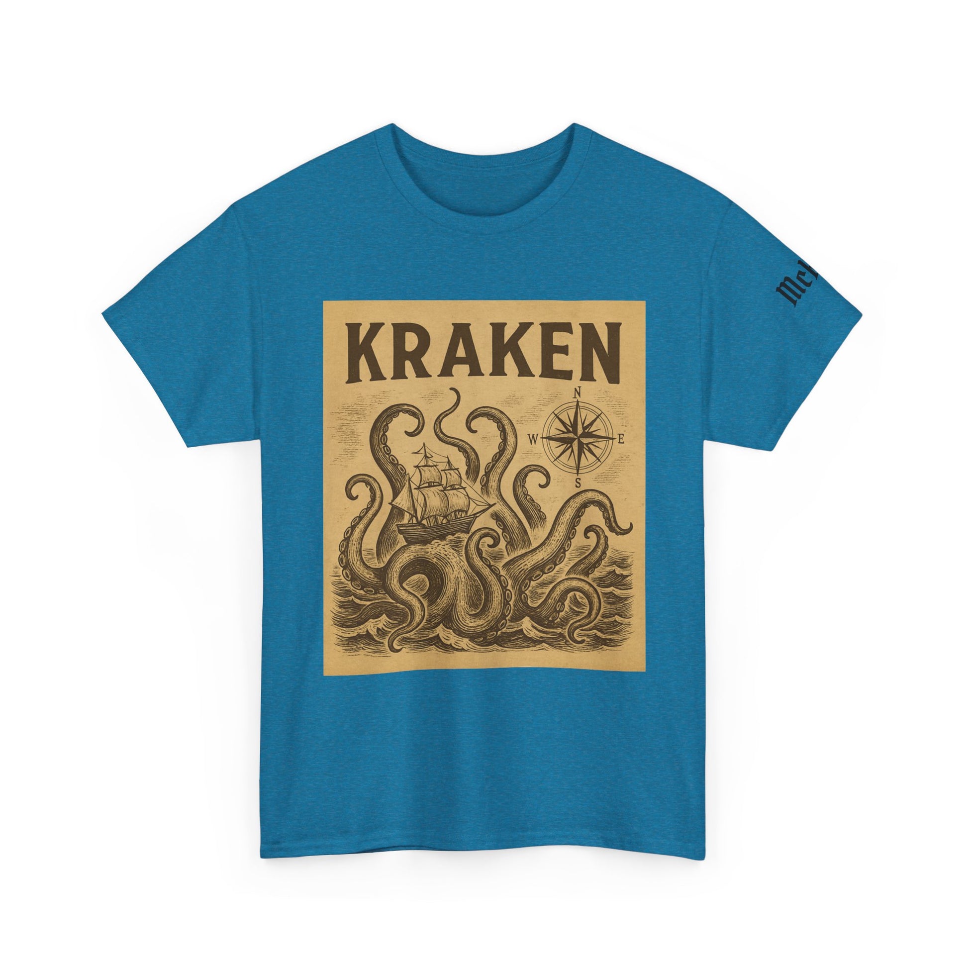This vintage-inspired tee summons the roar of open water and the thrill of old sea charts. The worn-paper kraken illustration sits front-and-center, tentacles unfurling around a tiny ship while a compass rose nods to seafaring lore. It feels like a weathered poster found in a captain’s chest — faded edges, bold lettering, and a warm, sun-bleached palette that pops against deeper tee colors. Wear it on coastal drives, local craft-fairs, or nights out with fellow ocean lovers; it slips into a laid-back wardrobe and speaks to anyone who loves maritime history, oddities, and a bit of salty mystery. The fabric is sturdy yet comfortable, holds prints crisply, and washes well so the design keeps its character through many adventures.