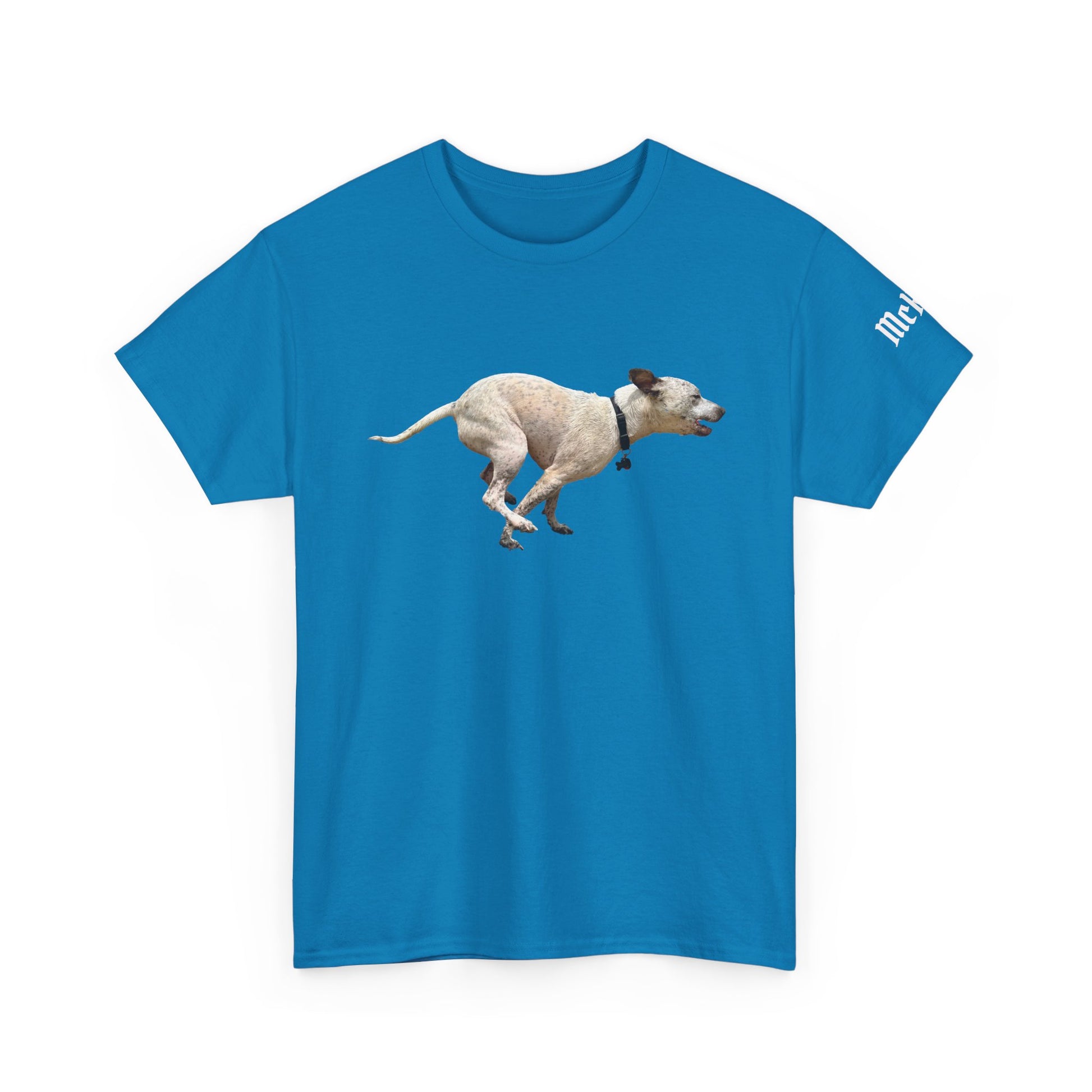 This relaxed-fit tee captures a single, joyous moment: a dog mid-run, ears back and all four paws off the ground. It feels breezy and alive — the kind of shirt you reach for when you want to wear a small, uncomplicated smile. Soft, sturdy cotton and a neat crew neck keep the silhouette simple so the running-dog graphic takes center stage. Wear it on neighborhood walks, at dog-park meetups, or when you need a casual layer that speaks to easy afternoons and kinetic energy.