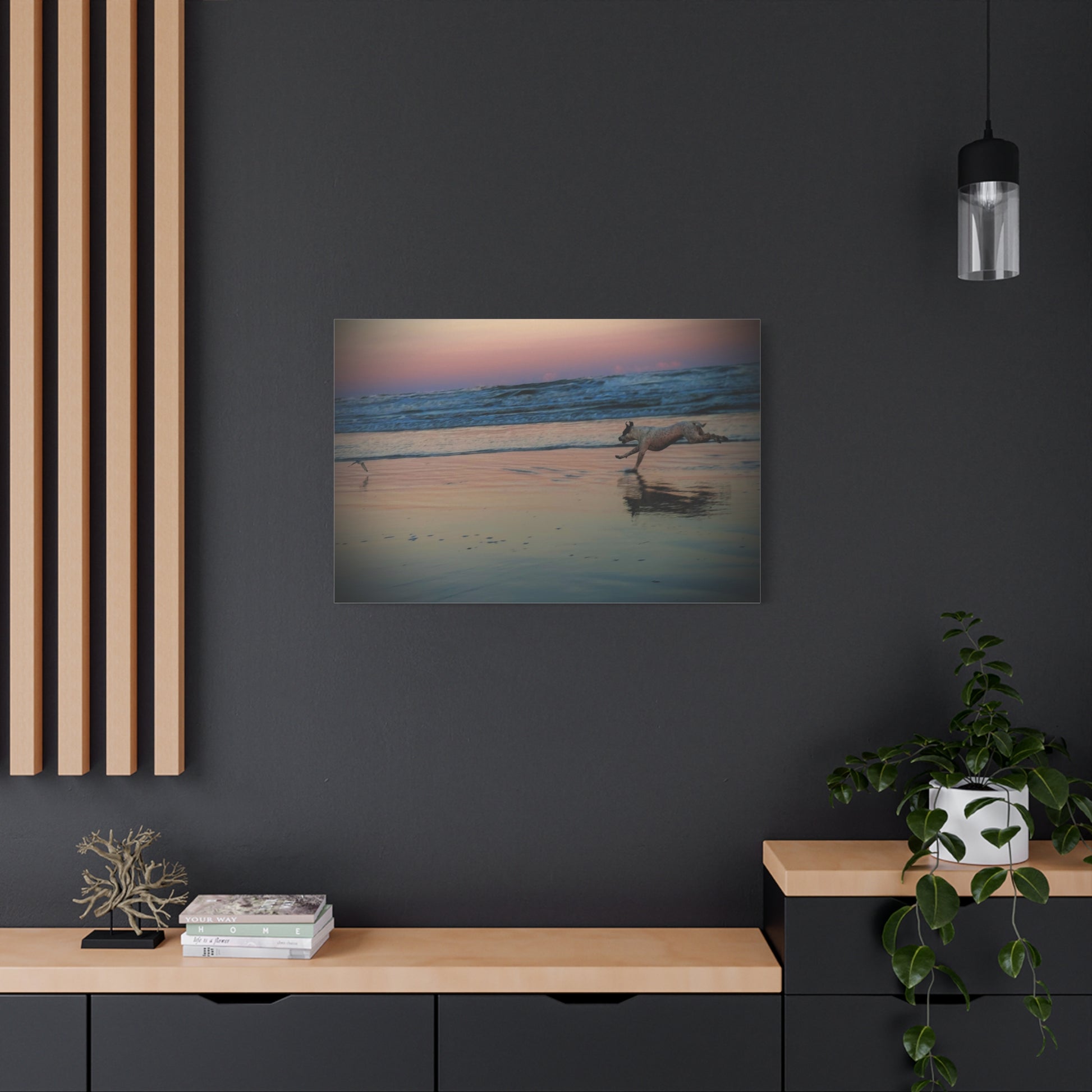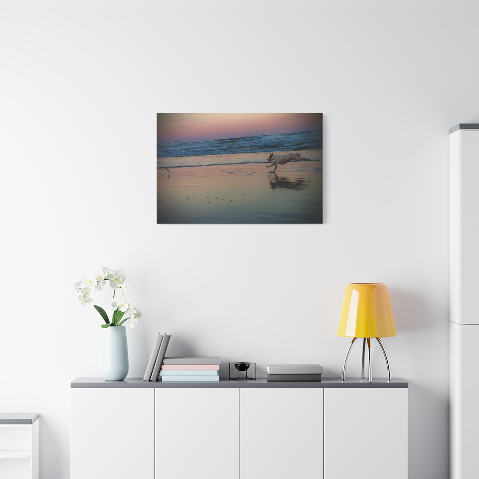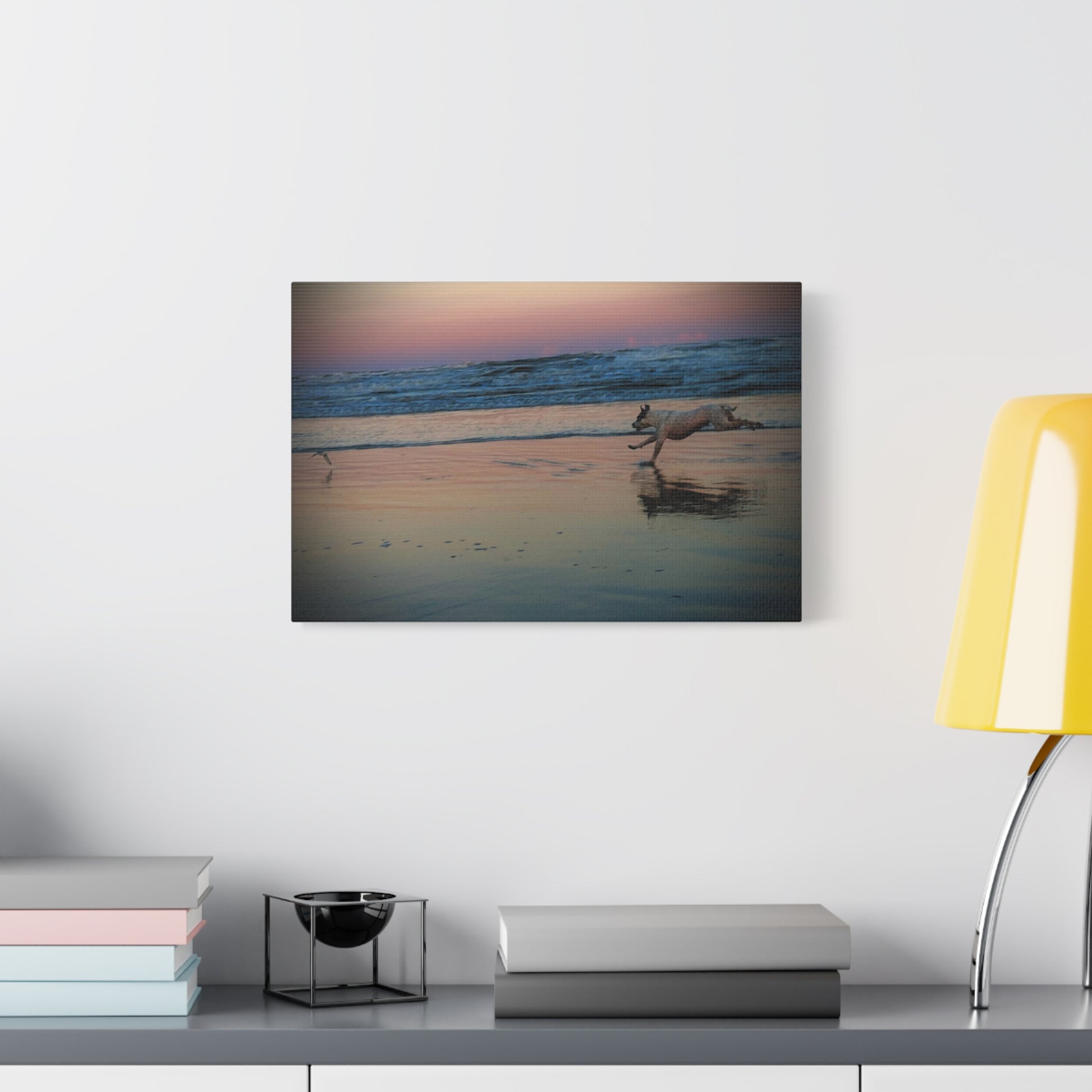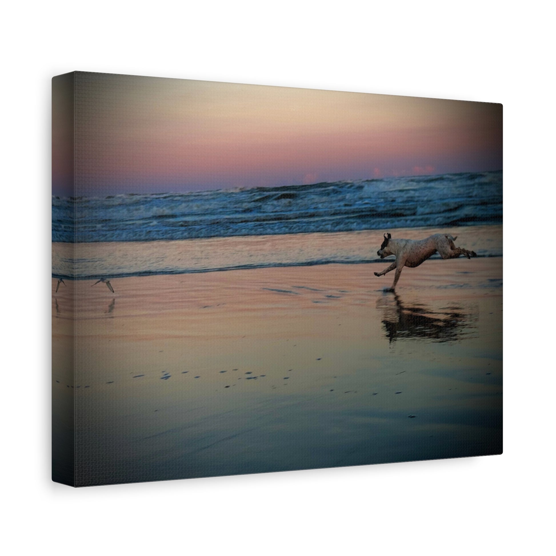 Seaside Sunset Canvas Print — Running Beach Dog Wall Art (Matte Stretched 1.25")