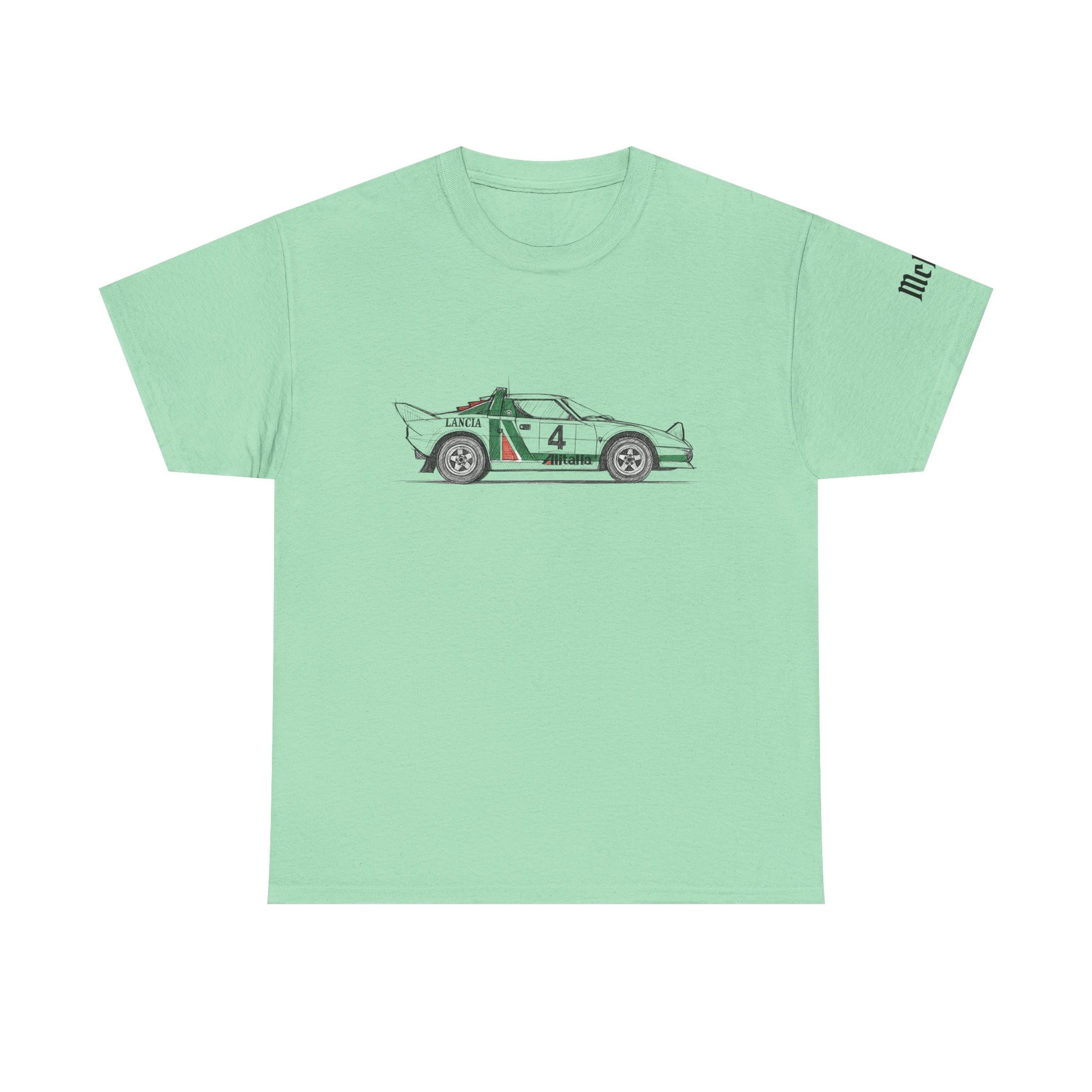 A bold, vintage-style tee featuring a hand-drawn Lancia Stratos HF, the unmistakable wedge-shaped rally icon of the Group 4 era. The illustration sits cleanly on the chest, crisp and detailed without overwhelming the shirt — the kind of design that fellow enthusiasts instantly nod at.