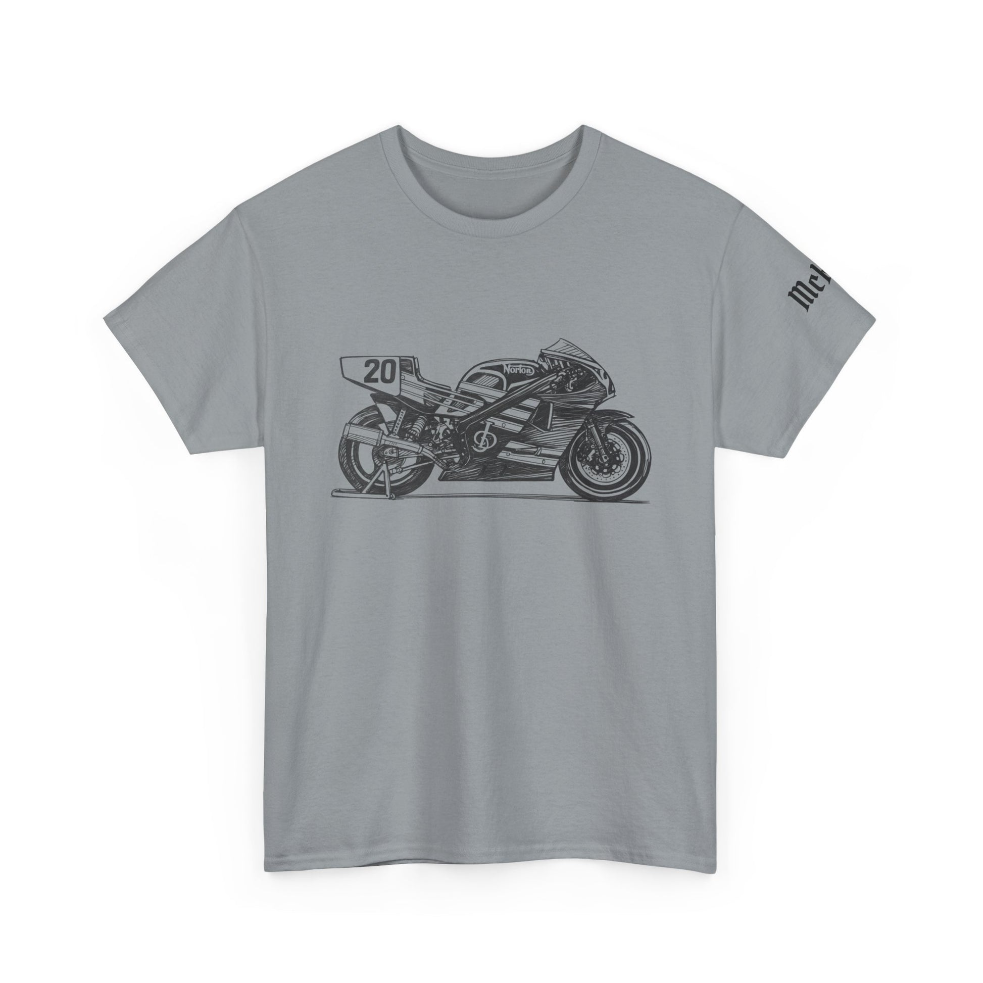 Lightweight, lived-in, and built for the open road. This classic crew tee features a finely detailed vintage sportbike sketch across the chest and a subtle sleeve logo — a restrained nod to speed and mechanical craft. The muted, dusty color keeps the look understated so the illustration takes center stage. Wear it to the garage, the coffee stop before a weekend twisty, or layered under a worn jacket when the sun drops low. It feels familiar from the first wear and only gets better with miles.