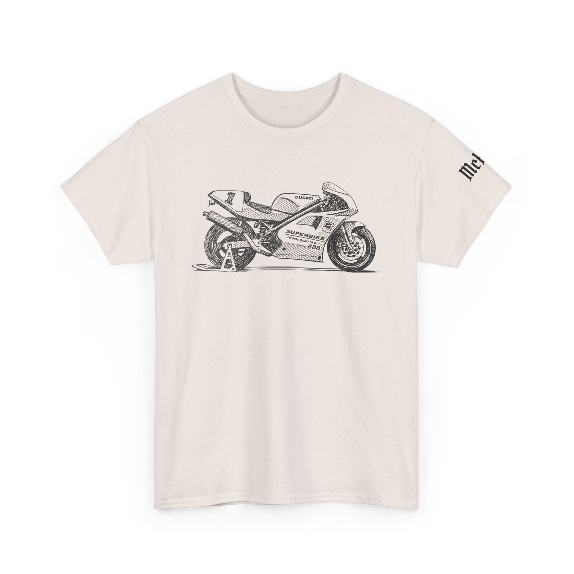 Textured natural tones and durable stitching mean this shirt will hold its shape through frequent wear. The print technique preserves fine line detail so the bike’s contours and mechanical bits stay sharp ride after ride. It’s for people who talk torque, check tire pressures, and measure time by the miles they’ve claimed. Slip it on and you’re ready to roll into conversations about late-night wrenching, asphalt, and the next open road.