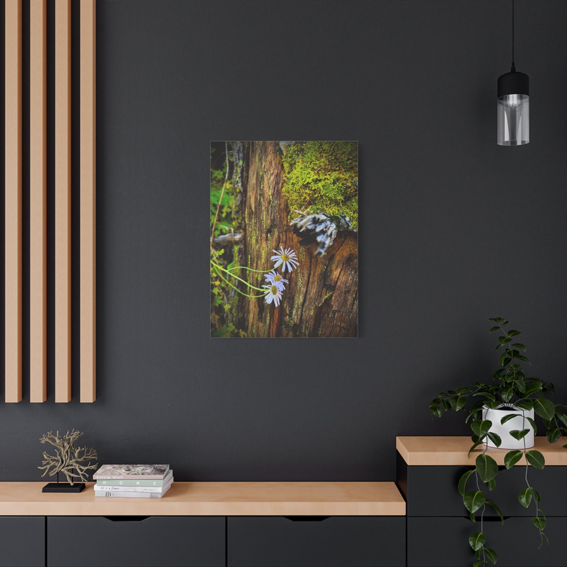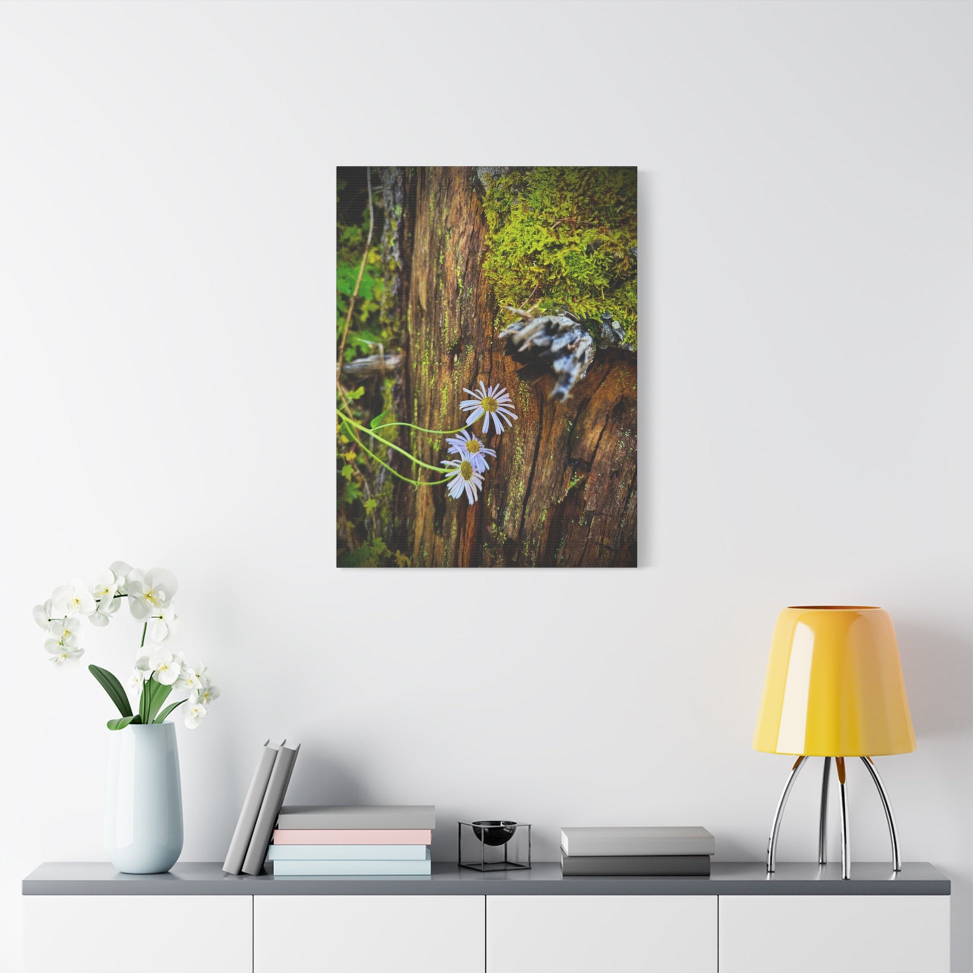 A matte stretched canvas print that brings a quiet forest moment into your home. Soft daisies push through moss and weathered wood in warm, earthy tones — a small study in resilience and stillness. The texture of the cotton-poly canvas and muted matte finish give the image a painterly feel, while the stretched pine frame keeps the piece grounded and ready to hang. This print settles easily into entryways, reading nooks, or cozy living rooms, inviting long looks and calm breaths.
